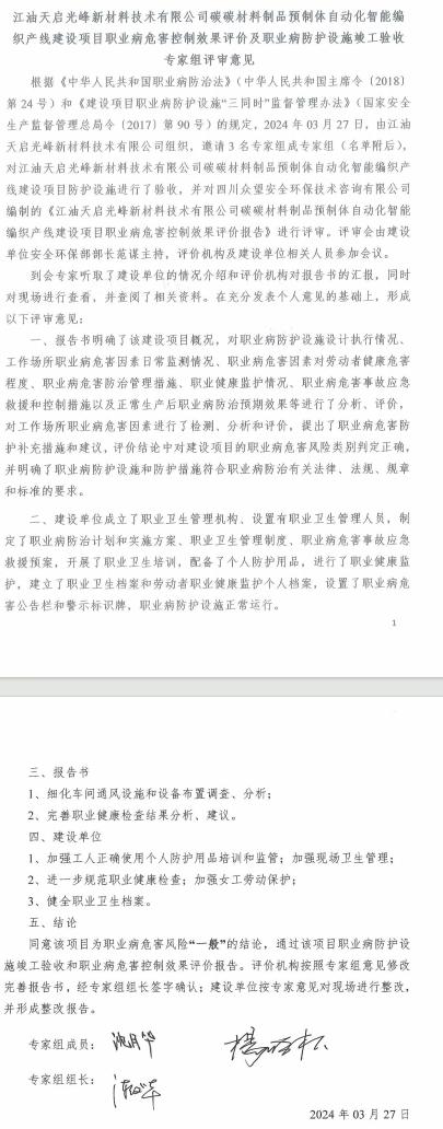 一、結論 根據《國民經濟行業分類》(GB/T 4754-2017),本項目屬于“產業用紡織制成品制造”。根據《國家衛生健康委辦公廳關于公布建設項目職業病危害風險分類管理目錄的通知》(國衛辦職健發〔2021〕5號),“產業用紡織制成品制造”屬于職業病危害一般的建設項目。結合該項目職業病危害因素的潛在危險性、接觸人數、接觸時間、職業病危害防護措施等進行綜合分析,判定該項目屬于職業病危害“一般”的建設項目。。 根據對該項目現場調查、職業病危害因素檢測結果和項目相關資料的綜合分析,該項目在實施過程中能夠落實有關職業病危害防護措施,在生產狀況正常,職業病危害防護設施正常運行的情況下,佩戴有效的個人防護用品,工人實際接觸的職業病危害因素的濃度/強度能夠控制在職業接觸限值內,符合國家有關職業衛生標準、規范的要求。該項目已具備職業病防護設施竣工驗收的條件。 二、建議: 根據《職業病危害項目申報辦法》(國家安全生產監督管理總局令第48號)第四條規定:職業病危害申報工作實行屬地分級管理。該項目應當按照“國家衛生健康委職業健康司”的要求在新版“職業病危害項目申報系統”(網址:www.zybwhsb.com)申報職業危害。 根據《工作場所職業衛生管理規定》(國家衛生健康委員會令〔2021〕5號令)第十五條:產生職業病危害的用人單位,應當在醒目位置設置公告欄,公布有關職業病防治的規章制度、操作規程、職業病危害事故應急救援措施和工作場所職業病危害因素檢測結果。補充操作規程。 根據《工作場所職業病危害警示標識》(GBZ158-2003),在作業場所出入口、作業崗位或顯著位置設置職業病危害警示標識、中文警示說明及職業病危害告知卡。對于設置工作,企業法人是第一責任人,負責職業健康工作的主要負責人和業務主管人員是設置公告欄的直接人,切實履行好職責和義務,積極開展工作。 警示標識、告知卡每半年至少檢查一次,如發現有破損、變形、褪色等不符合要求時要及時修整或更換;除警示、告知外,建設方還可以在車間設置相關宣傳欄,公布有關職業病防治的規章制度、操作規程、職業病危害事故應急救援措施和工作場所職業病危害因素檢測結果,以加強工人意識教育。 公司與新老員工簽訂合同時,將工作過程中可能產生的職業病危害及其后果、職業病危害防護措施和待遇等如實告知,并在勞動合同中寫明。未與在崗員工簽訂職業病危害勞動告知合同的,應按國家職業病危害防治法律法規的相關規定與員工進行補簽。 員工在已訂立勞動合同期間,因工作崗位或者工作內容變更,從事與所訂立勞動合同中未告知的存在職業病危害的作業時,由管理部門向員工如實告知,現所從事的工作崗位存在的職業病危害因素,并簽訂職業病危害因素告知補充合同。 建設單位應根據《國家安全監管總局辦公廳關于印發職業衛生檔案管理規范的通知》(安監總廳安健〔2013〕171號)的要求,建立健全職業衛生檔案。包括:建設項目職業衛生(三同時)、職業健康監護管理檔案、宣傳培訓檔案、監測與檢測評價檔案、職業衛生管理檔案、員工個人職業健康檔案、法律法規等7大類檔案。 根據《用人單位職業健康監護監督管理辦法》(國家安全生產監督管理總局令〔2012〕第49號)建立、健全勞動者職業健康監護檔案。 對從事接觸職業病危害因素作業的勞動者,用人單位應當按照《用人單位職業健康監護監督管理辦法》、《放射工作人員職業健康管理辦法》、《職業健康監護技術規范》(GBZ188-2014)、《放射工作人員職業健康監護技術規范》(GBZ235)等有關規定組織上崗前、在崗期間、離崗時的職業健康檢查,并將檢查結果書面如實告知勞動者。 本項目碳釬維粉塵可能導致眼刺激,流淚、刺痛、充血等,還應當為接觸碳釬維粉塵的崗位配發護目鏡。 用人單位不得因女職工懷孕、生育、哺乳降低其工資、予以辭退、與其解除勞動或者聘用合同。 女職工在孕期不能適應原勞動的,用人單位應當根據醫療機構的證明,予以減輕勞動量或者安排其他能夠適應的勞動。對懷孕7個月以上的女職工,用人單位不得延長勞動時間或者安排夜班勞動,并應當在勞動時間內安排一定的休息時間。懷孕女職工在勞動時間內進行產前檢查,所需時間計入勞動時間。 女職工比較多的用人單位應當根據女職工的需要,建立女職工衛生室、孕婦休息室、哺乳室等設施,妥善解決女職工在生理衛生、哺乳方面的困難。 任何單位和個人不得將產生職業病危害的作業轉移給不具備職業病防護條件的單位和個人。不具備職業病防護條件的單位和個人不得接受產生職業病危害的作業。 |