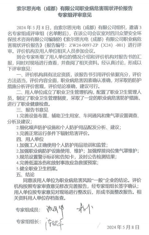 索爾思光電(成都)有限公司職業(yè)病危害現(xiàn)狀評(píng)價(jià) |