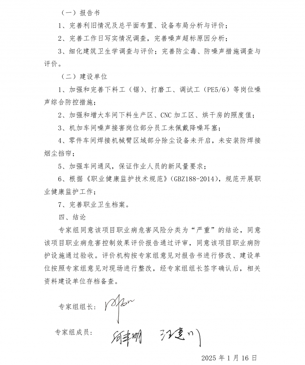 結論:項目控制效果評價判定為“職業病危害風險分類嚴重”的建設項目。 根據對本項目現場調查、職業病危害因素檢測結果和項目相關資料的綜合分析,本項目職業衛生防治工作符合國家法律、法規的相關規定,采取的職業病防治措施基本可行,日常運行過程中在一定程度上能控制和降低職業病危害因素對作業人員健康的影響,項目在落實了本次評價報告提出的補充措施和建議后,能夠滿足職業病防治工作的需要。本項目已具備職業病防護設施竣工驗收的條件。 建議: (1)車間加強通風要求,保證作業人員的新風量要求。 (2)根據《職業健康監護技術規范》(GBZ188-2014)結合項目實際情況,做好健康監護工作,“兩檔”管理制度。“兩檔”內容包括職業衛生檔案和職業健康監護檔案。 (3)按照《用人單位職業健康監護監督管理辦法》(國家安監總局令〔2012〕第49號)、《職業健康監護技術規范》(GBZ188-2014)相關規定對新進或調崗作業人員進行崗前體檢、并對離崗或調離作業人員進行離崗健康檢查。 (4)建設單位應按照《工作場所職業衛生管理規定》(國家衛生健康委員會令〔2020〕第5號)的規定:職業病危害嚴重的用人單位,應當委托具有相應資質的職業衛生技術服務機構,每年至少進行一次職業病危害因素檢測,每三年至少進行一次職業病危害現狀評價。檢測、評價結果應當存入本單位職業衛生檔案,并向衛生健康主管部門報告和勞動者公布。 (5)建設單位應根據《職業病危害項目申報辦法》(國家安全生產監督管理總局令第48號)的規定,將此次控制效果評價報告與職業病危害因素現場檢測結果向當地主管部門進行申報。 (6)根據《國家衛生健康委辦公廳關于進一步加強用人單位職業健康培訓工作的通知》國衛辦職健函〔2022〕441號的要求進行職業衛生培訓。 (7)定期對除塵、廢氣處理設施進行檢查、維護,發現有堵塞、損壞或其他原因導致不能正常工作的,應及時進行清理、設備維修,并做好相關維護保養記錄。 (8)加強噪聲作業人員的個體防護和職業健康監護。 (9)加強外委作業人員的職業衛生管理,對焊工、打磨工加強個體防護和職業健康監護。 (10)建設單位應加強女工的勞動保護,不得安排孕期、哺乳期的女職工從事對本人和胎兒、嬰兒有危害的作業。 (11)應急救援物資的使用人員,應接受相應的培訓,熟悉裝備的用途、技術性能及有關使用說明資料,并遵守操作規程;及時對車間內配備的應急救援藥箱進行檢查,對應急救援藥品進行有效性查驗,及時補充更換。 (12)粉塵防爆措施嚴格以安全評價報告、安全設施設計專篇提出的措施為準。 (13)針對維修、清污存在的受限空間作業危害,應加強受限空間作業監管,嚴格按照《缺氧危險作業安全規程》(GB8958-2006)、《密閉空間作業職業危害防護規范》(GBZ/T205-2007)進行作業。 (14)本次職業病危害控制效果評價只針對目前生產狀況,公司今后遇單位名稱、法定代表人或者負責人發生變更,須按時申報;或因技術、工藝或原輔材料發生改變而引起職業病危害因素發生變化時,應進一步進行職業病危害因素評價。 |
