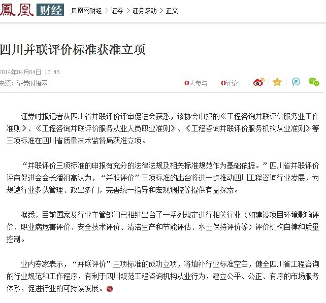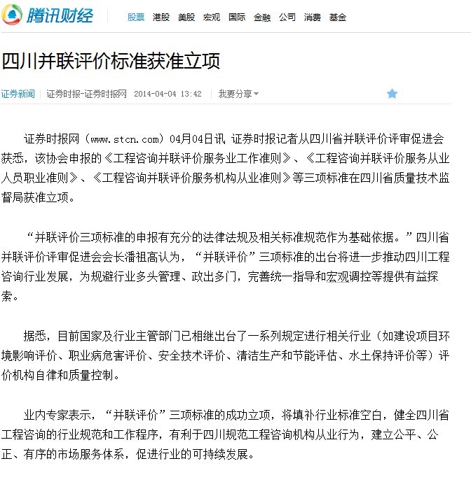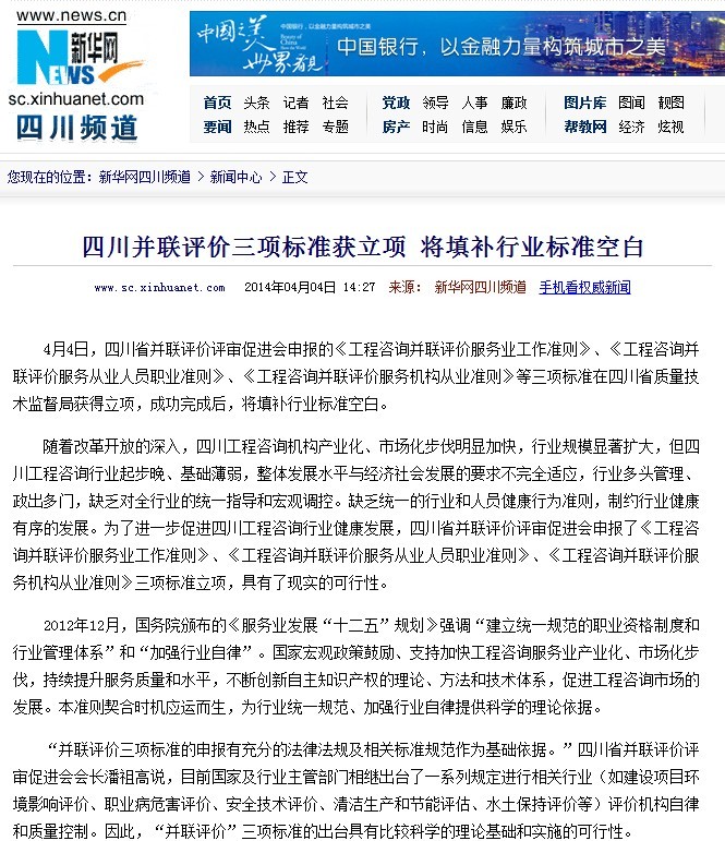 人民網成都4月5日電 (宋艷)近日,記者從四川省并聯評價評審促進會獲悉,該協會申報的《工程咨詢并聯評價服務業工作準則》、《工程咨詢并聯評價服務從業人員職業準則》、《工程咨詢并聯評價服務機構從業準則》等三項標準在四川省質量技術監督局獲得立項,成功完成后,將填補行業標準空白。