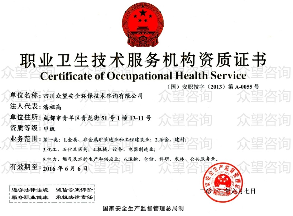 四川眾望自2010年取得職業(yè)衛(wèi)生技術(shù)服務(wù)機(jī)構(gòu)乙級(jí)資質(zhì)起即開始從事職業(yè)衛(wèi)生服務(wù)工作,于2013年6月7日取得職業(yè)衛(wèi)生技術(shù)服務(wù)機(jī)構(gòu)甲級(jí)資質(zhì)。在秉承“責(zé)任 規(guī)范 誠信 真相”的工作準(zhǔn)則下,眾望迄今已順利完成1300余項(xiàng)建設(shè)項(xiàng)目職業(yè)病危害因素日常檢測、職業(yè)病危害預(yù)評(píng)價(jià)、職業(yè)病危害控制效果評(píng)價(jià)及職業(yè)病危害現(xiàn)狀評(píng)價(jià)。